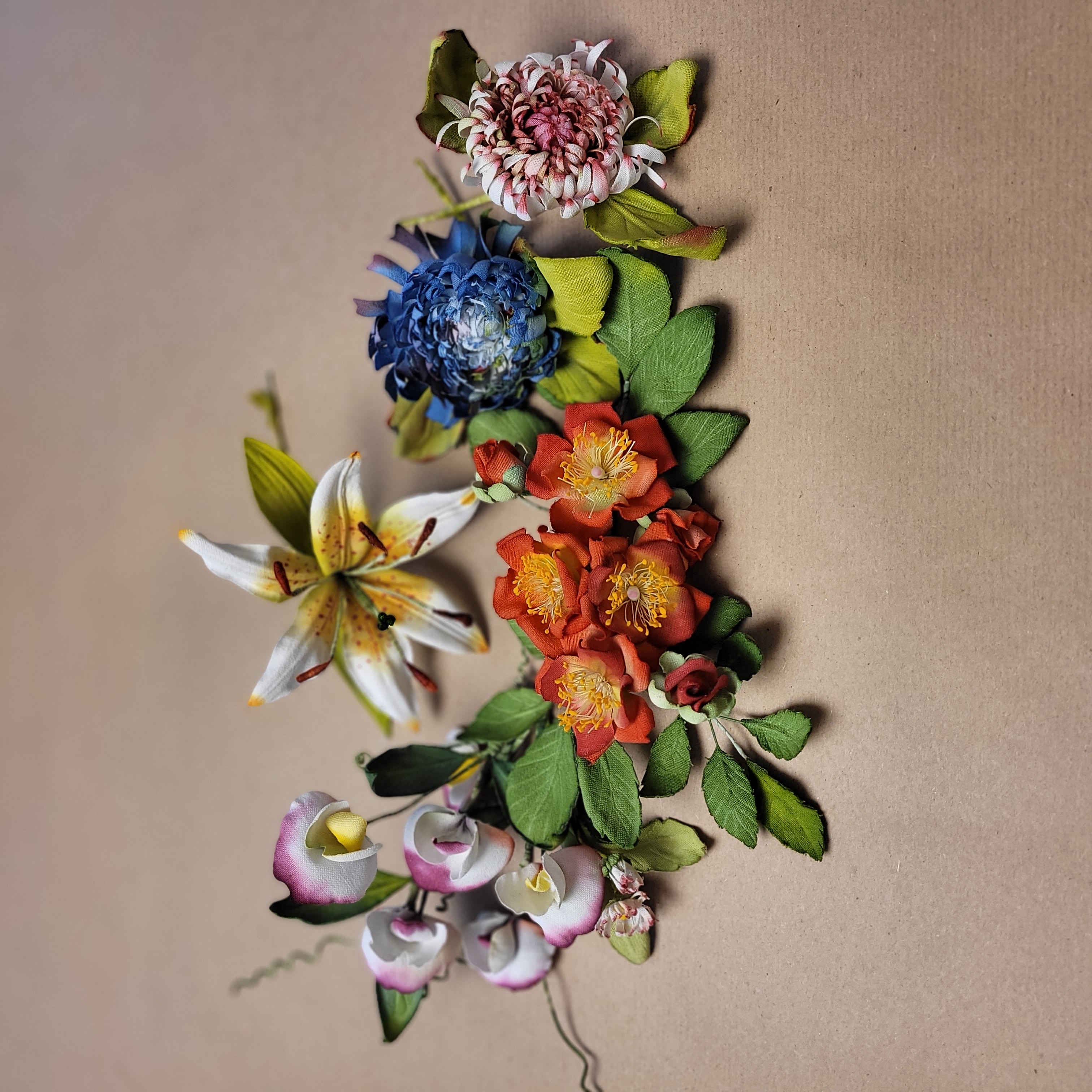 Des fleurs et parures florales entierement realisees a la main. Soie, organza, plumes... chaque petale est une creation unique.